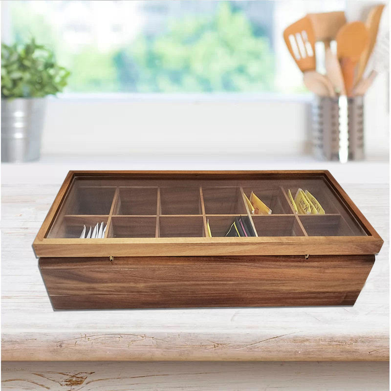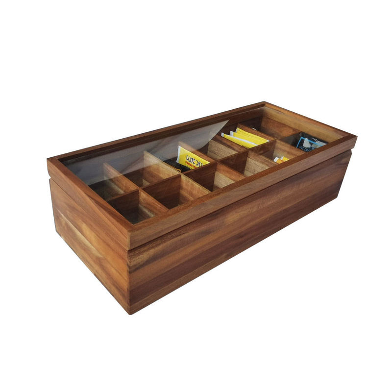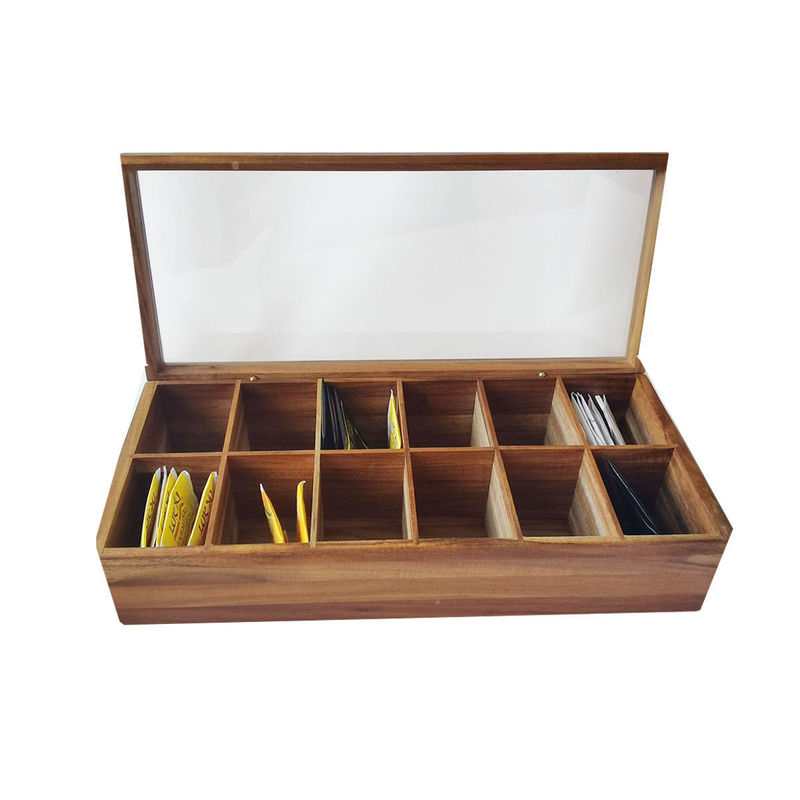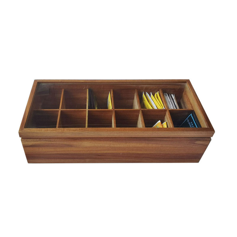 Dada Datar yang Dapat Disesuaikan 12 Kompartemen Diajukan Kayu Solid Organizer Kantong Teh Kotak Penyimpanan Organizer dengan Tutup Kaca