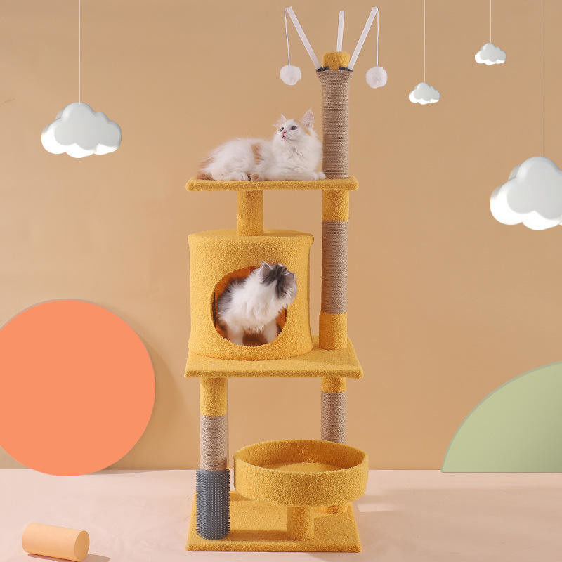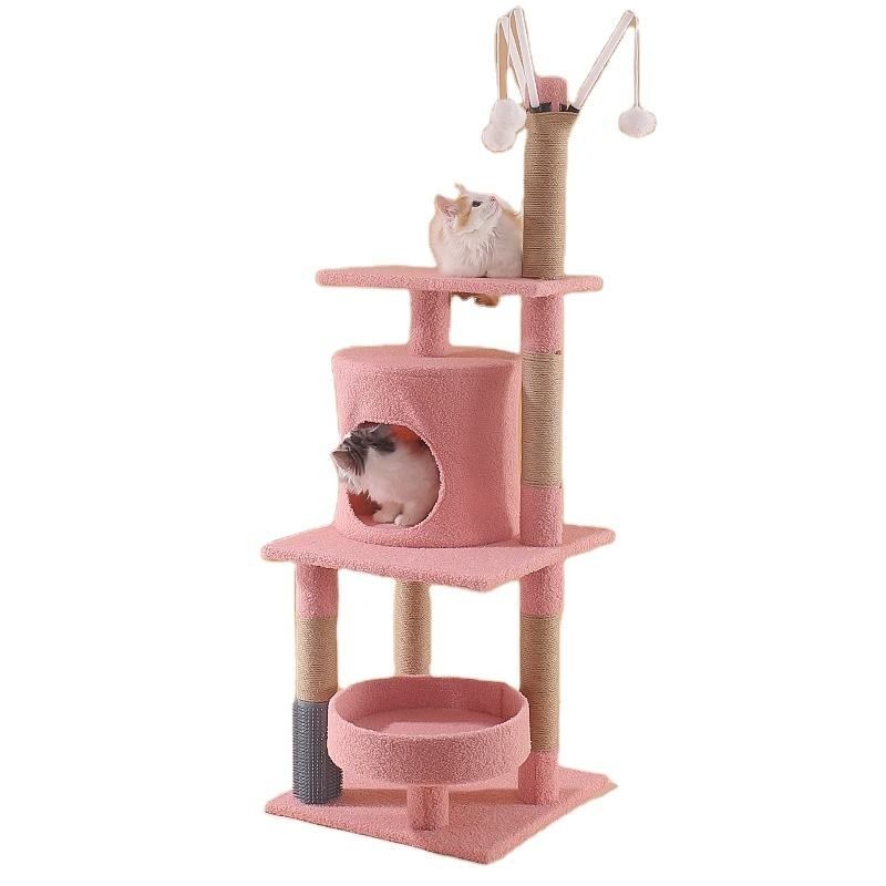 Tiang pengikis: Pohon menara panjat dilengkapi dengan tiang pengikis, biasanya dibungkus dengan tali atau kain alami, untuk menyediakan tempat yang ideal bagi kucing untuk menggosok kaki mereka, membantu mereka menurunkan cakar sambil melindungi furnitur.