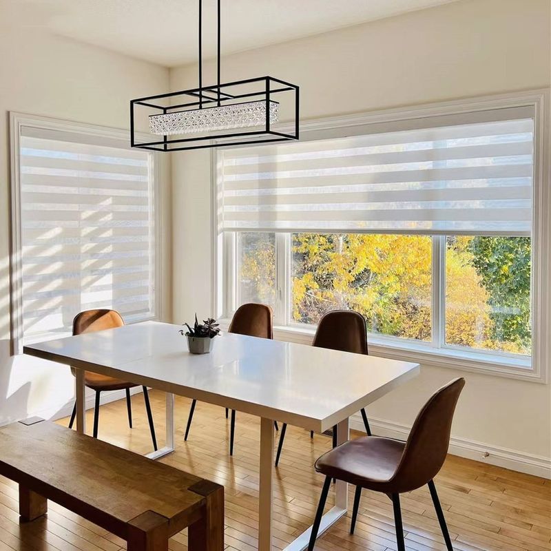 Zebra Shade, disebut juga Rainbow Shade, terbuat dari 100% polyester, dan bentuknya seperti 1 kain dengan 1 benang.2 lapisan sangat bagus dan nyaman untuk menyesuaikan lampu.Mudah dipasang dan cocok untuk ruangan yang berbeda.